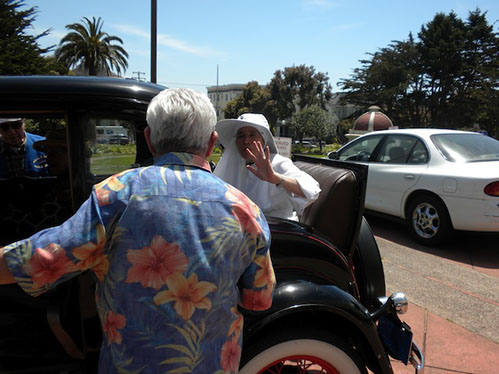 The ride is short. We travel up Arguello into the Presidio past the golf club to the lookout point overlooking the bay and Alcatraz. The ride takes us by Senator Feinsteins’ old home and then back down the hill to St. Anne’s. For most, one ride is enough. Others choose another car and take a second and sometimes third ride.