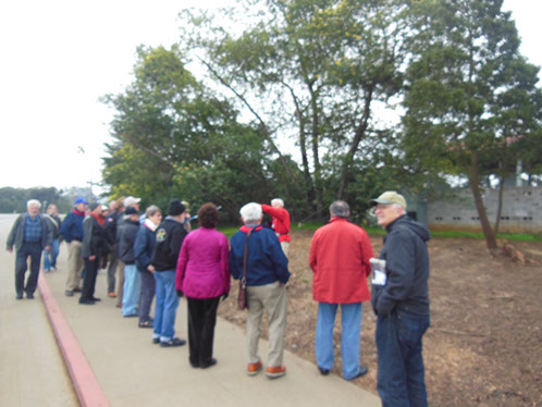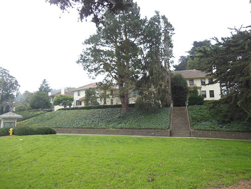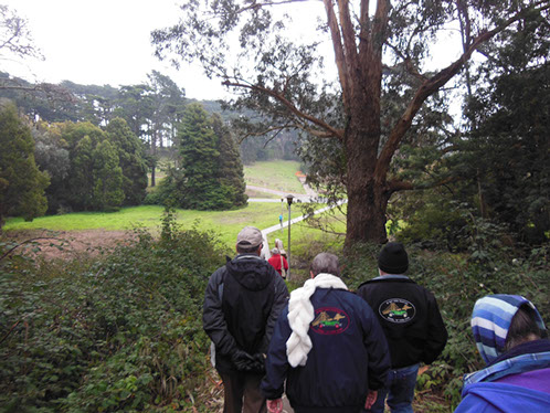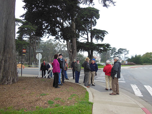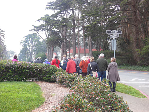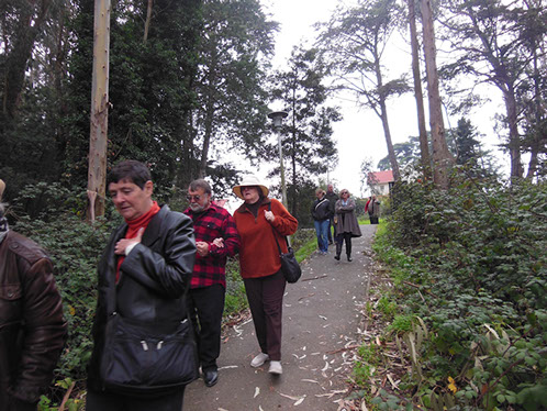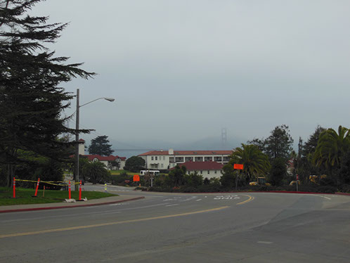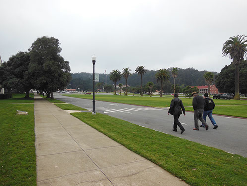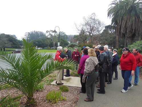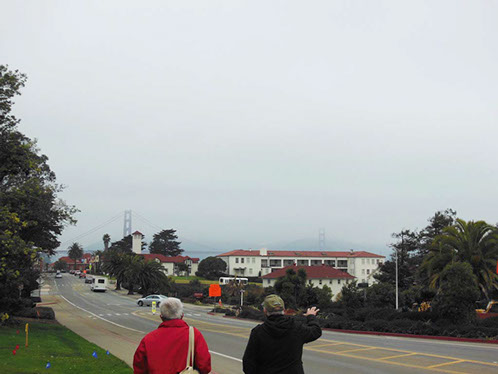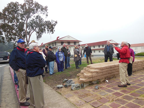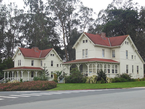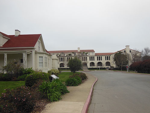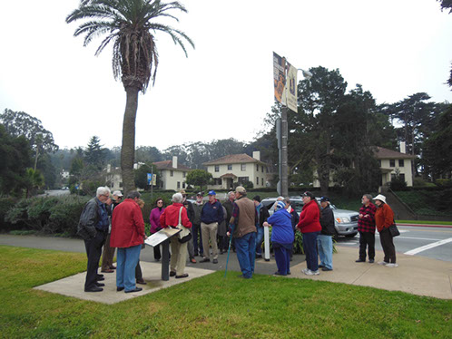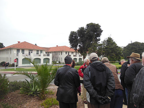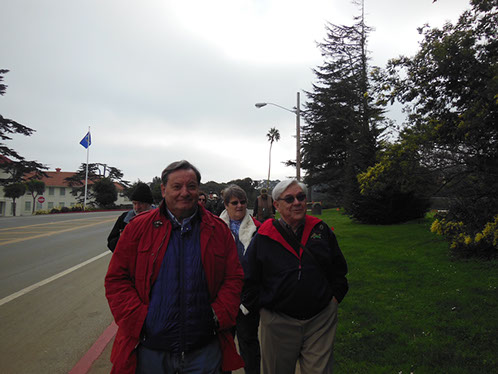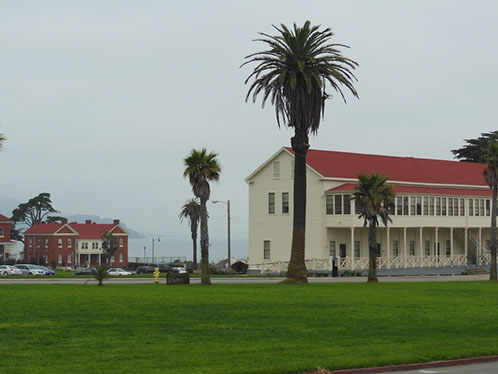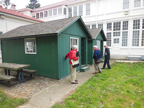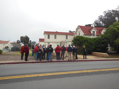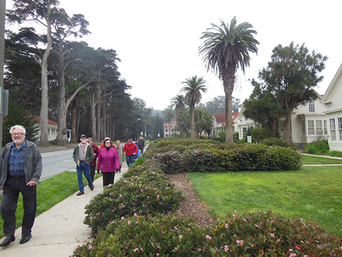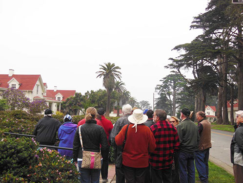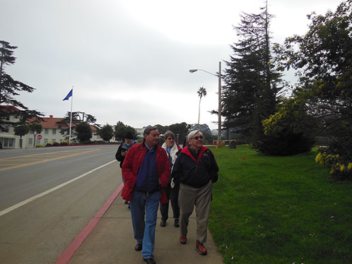 We had arranged for Peter Todd, a guide who works with the Walking Tours of San Francisco, to take our group on a one hour guided tour of the buildings and the east side of the Parade Ground and some of the surrounding area. The walk took us past Pershing Hall (now a hotel) and down Officers Row and then into a water shed area once called lovers lane due to the long held theory that the water here improved fertility. It was fertile enough to grow a lot of trees that are now being cleared to restore the area to the way it looked in the 1850’s. Following the 1906 earthquake this area was covered with cabins and tents that served as temporary housing. Several of the small one room cabins have been restored and are on display near the Parade Grounds.