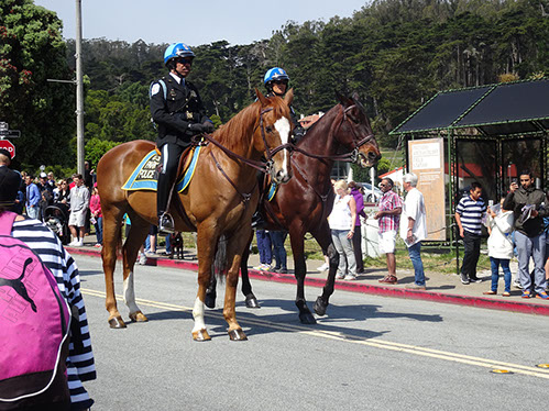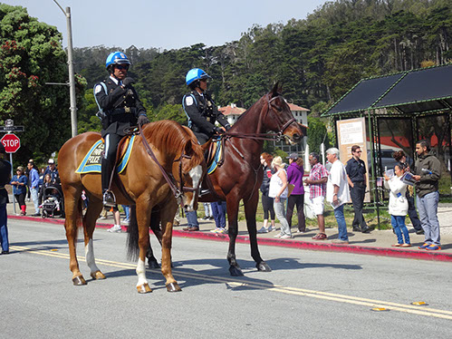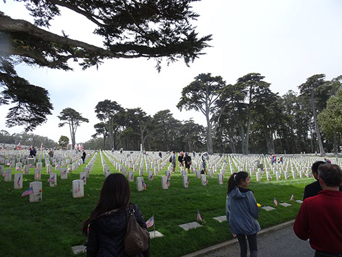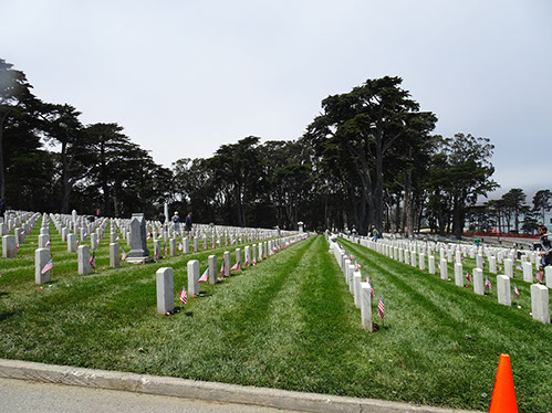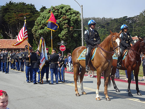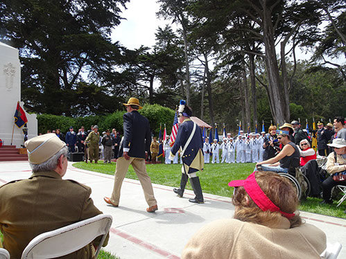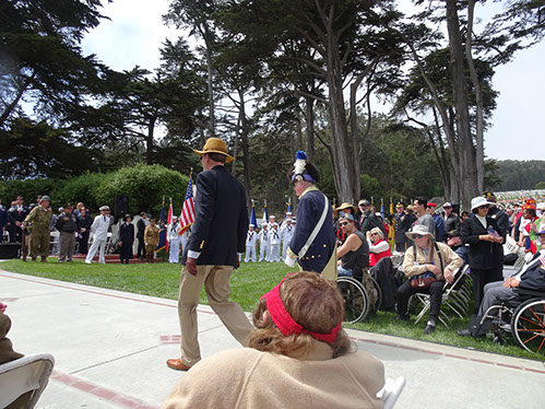 The event begins with a Grand March from the Parade Ground into the National Cemetery. Marching units from local military schools, a Marine Corp Band, and veterans in full uniform, are formed into groups and are ushered into their place by parade organizers. By parade time there is assembled along the parade route a substantial gallery of onlookers, mostly veterans and their families. Once the band strikes up we began the short parade into the San Francisco National Cemetery.