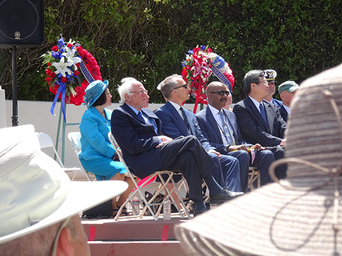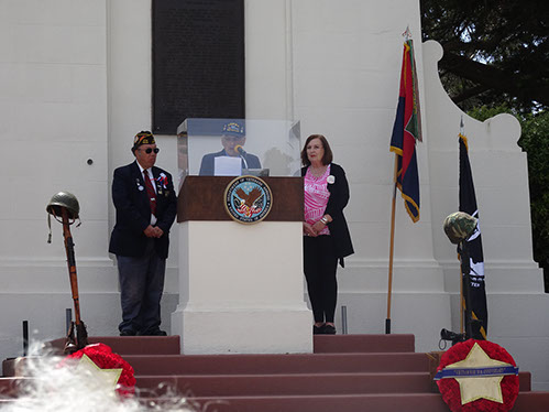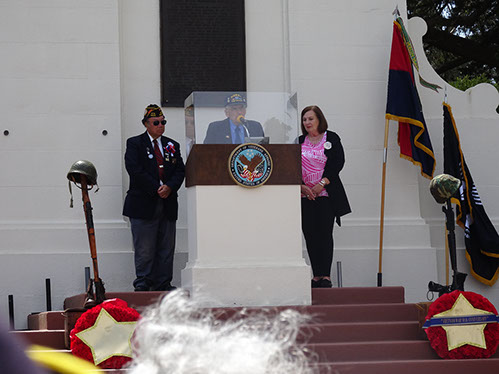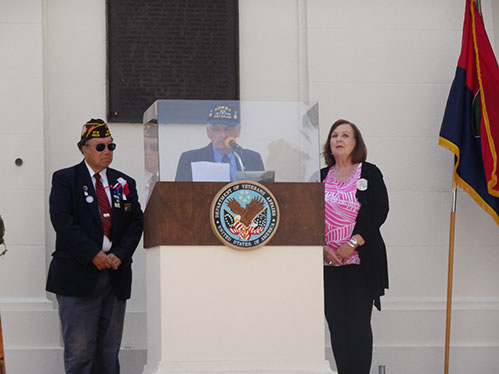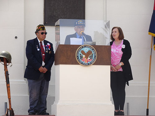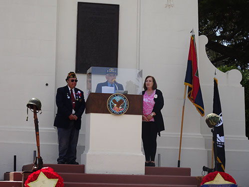 Then came the program. Wallace Levin, Master of Ceremonies and a veteran of the Korean War, began by introducing Carol Autrey, whose father Marine Corporal Charles Gordon Smith was wounded during a landing on Guam on June 21, 1944, and died later that day aboard the USS Warren, and was buried at sea. Carol (sister of Scott Williams) was there to remember and honor her father, as well as to represent all those family members who bear the loss of those who pay the ultimate price in order to preserve the freedom we so often take for granted. Prayers were offered, and there were patriotic songs and speeches honoring those who gave their lives for our country. The ceremony ended with a twenty-one gun salute and closing remarks. It was a wonderful day of remembrance. We were greatly honored to have played a small part.