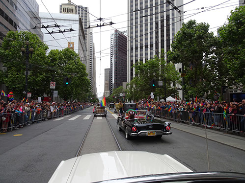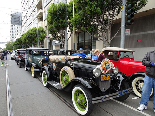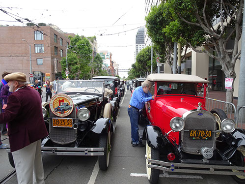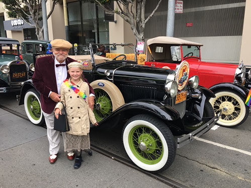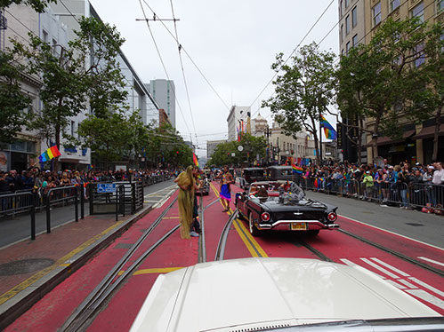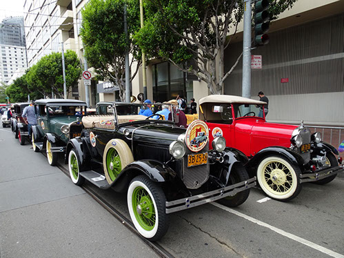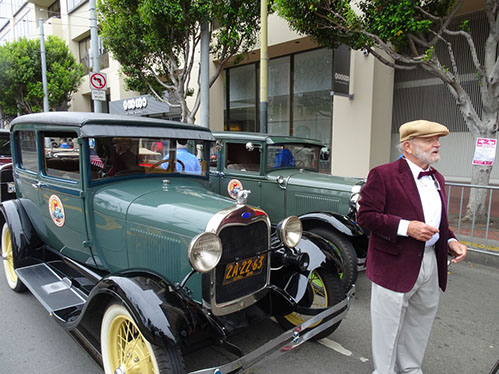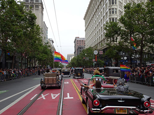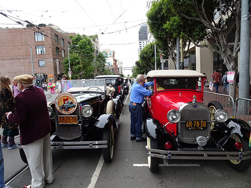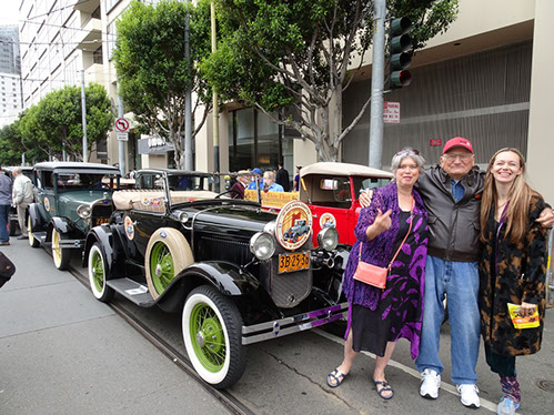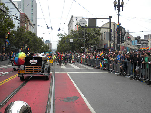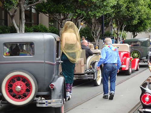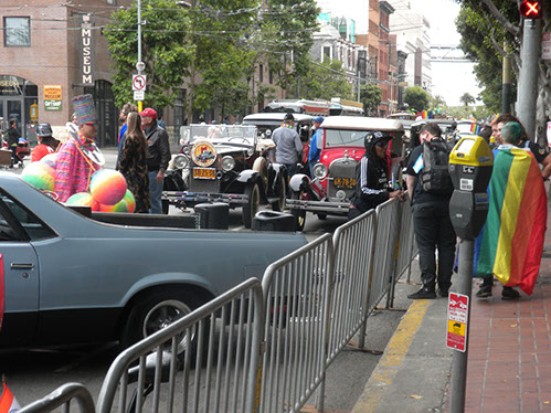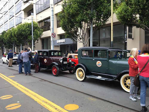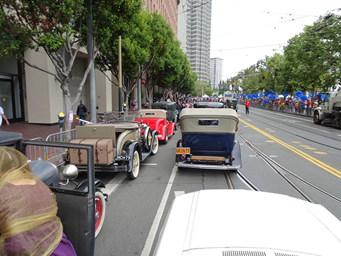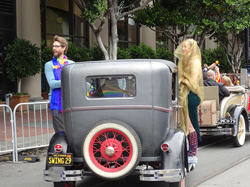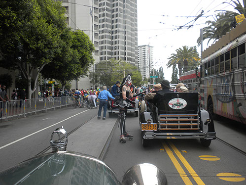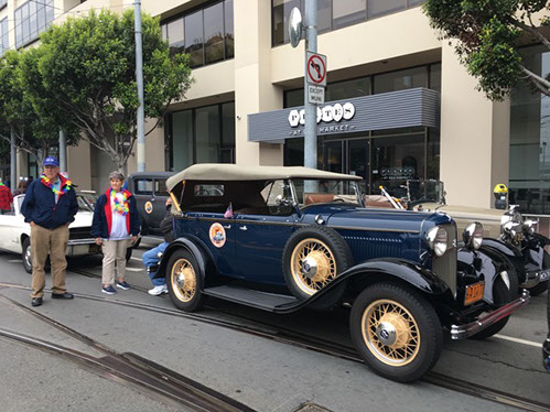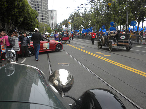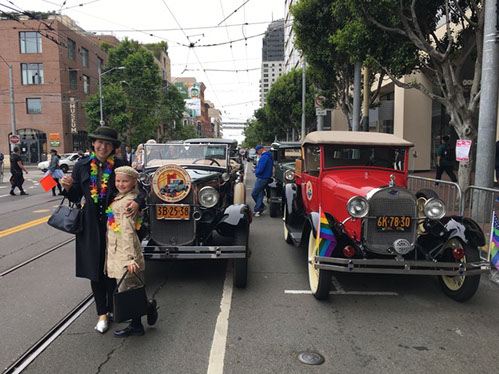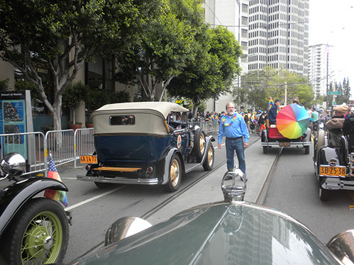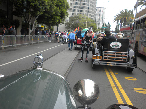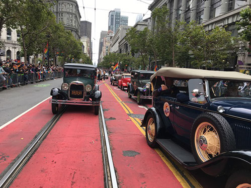 This year we had seven model A's and a small group of four Fords from later years. The cars were decked out in rainbow colors and filled with happy people. We followed the Dykes on Bikes motorcycles and the Bicycle Coalition down Market to the grandstand at Civic Center. Although our cars were less colorful and lacked the “bling" of those in costume, we were very well received.