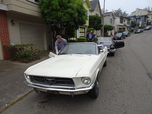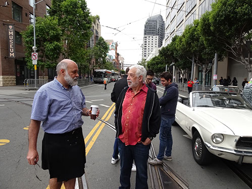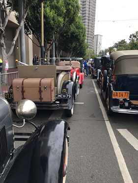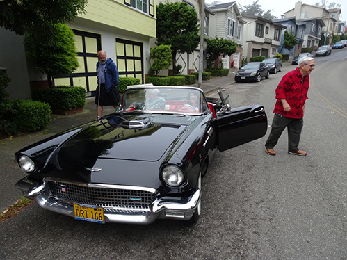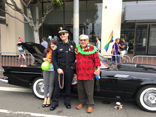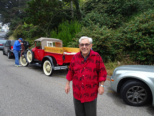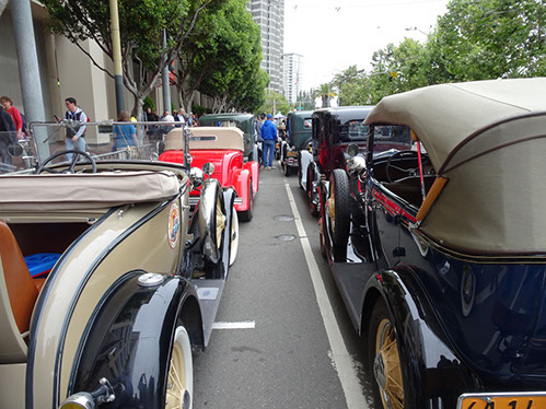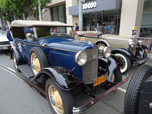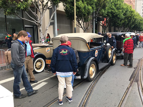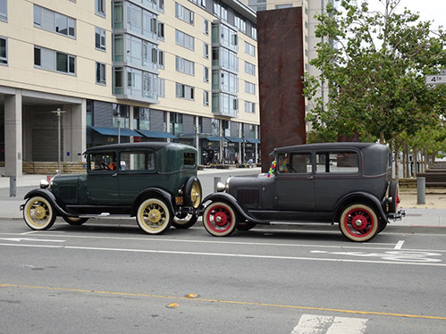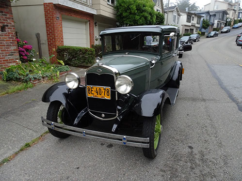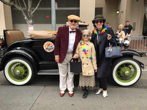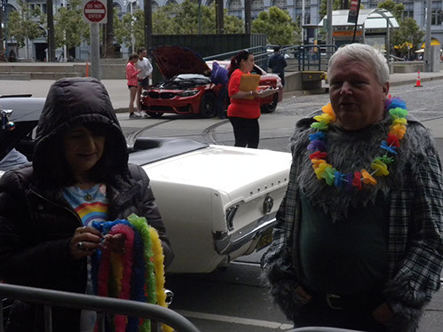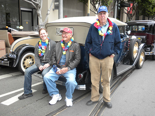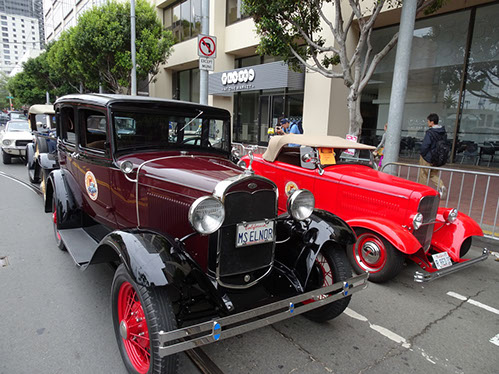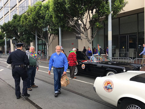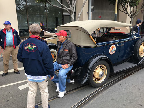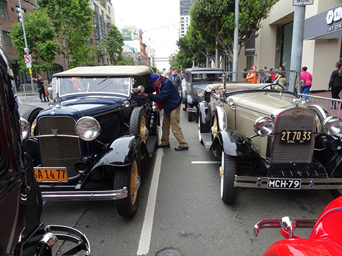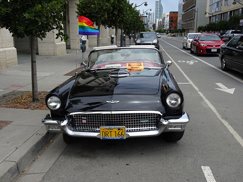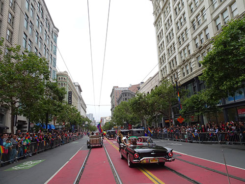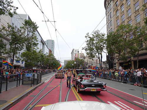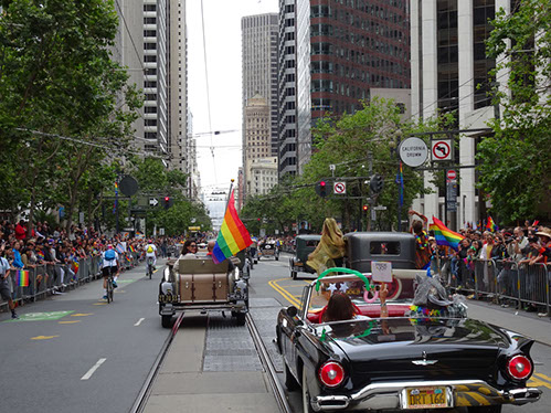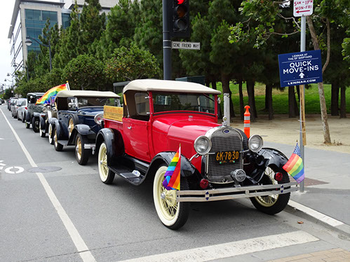 This year we had seven model A's and a small group of four Fords from later years. The cars were decked out in rainbow colors and filled with happy people. We followed the Dykes on Bikes motorcycles and the Bicycle Coalition down Market to the grandstand at Civic Center. Although our cars were less colorful and lacked the “bling" of those in costume, we were very well received.