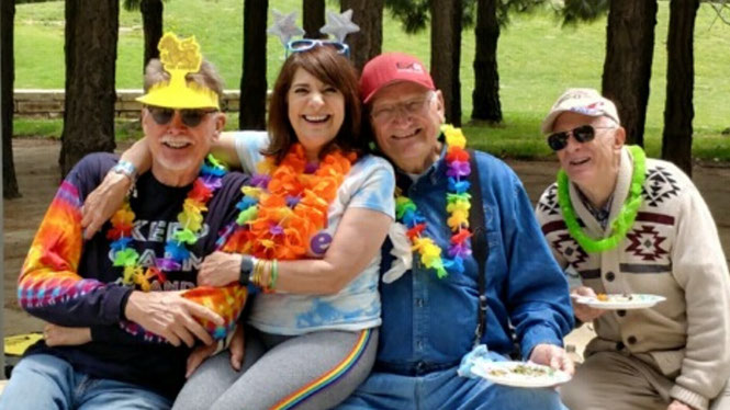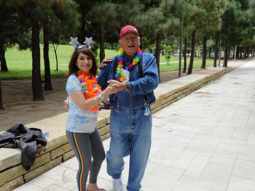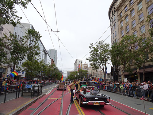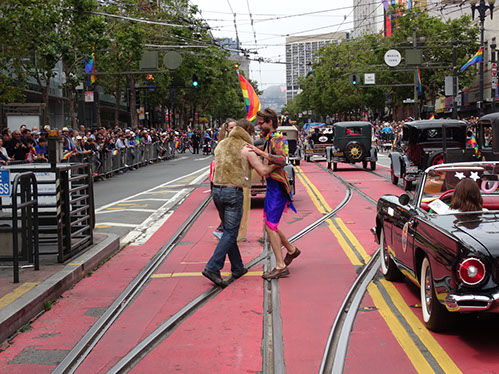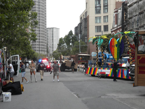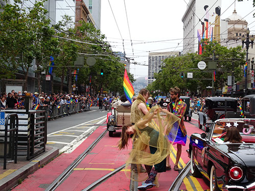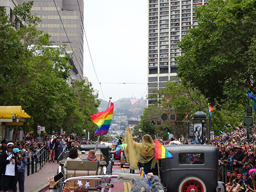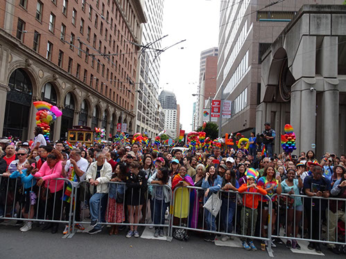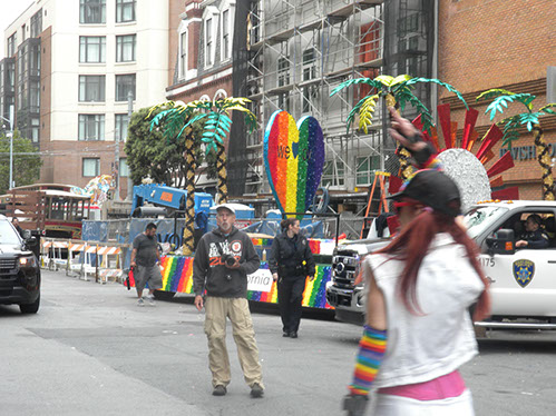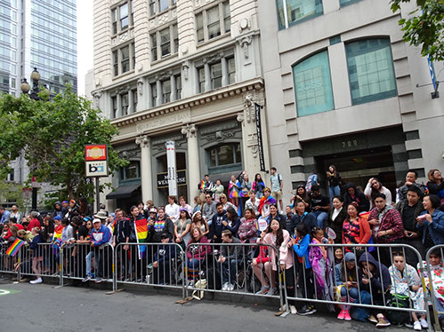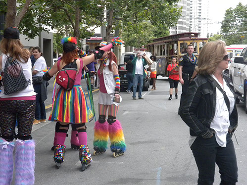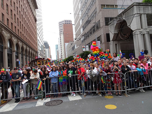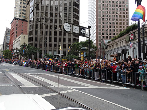 The Pride Parade was bigger and better than ever. It resembles the Cirque du Soleil. Corporate floats and eclectic groups of brightly dressed bikers and cyclists pass by in gay profusion, swaying to the music of the band ahead or the amplified boom box someplace behind. Parade goers dressed in imaginative colorful costume, some in nothing at all, line the route. The crowd strains against the barricades to get a picture or to join in with whistles and hurrahs. The whole thing is a giant party; people young and old from all walks of life celebrating the day.
