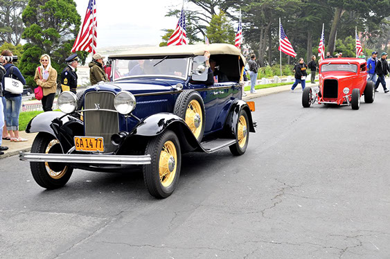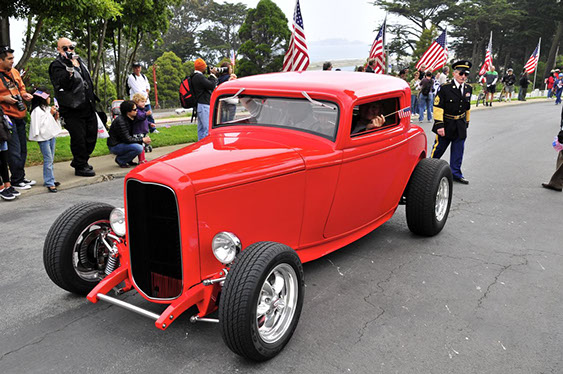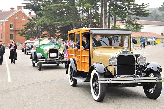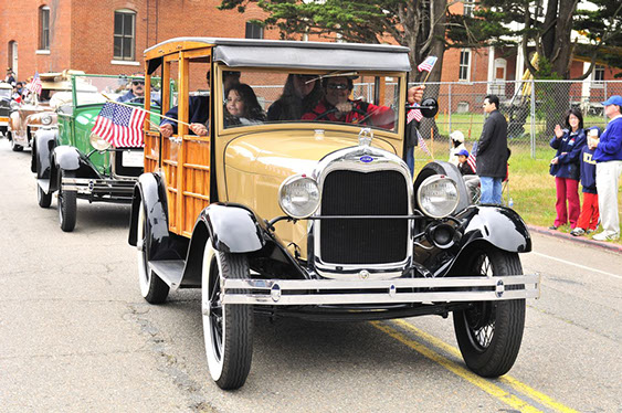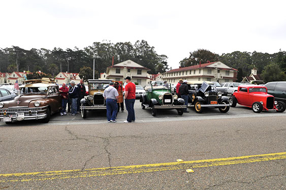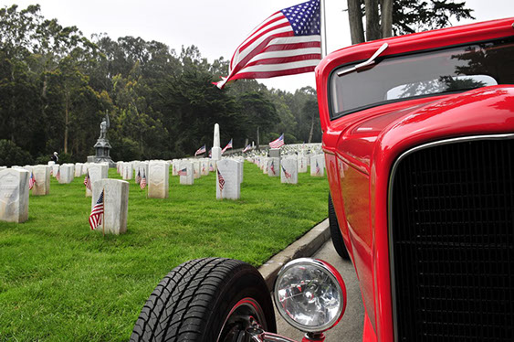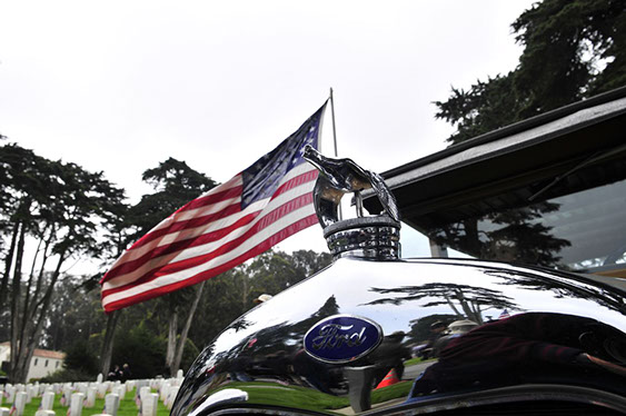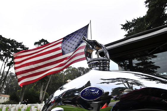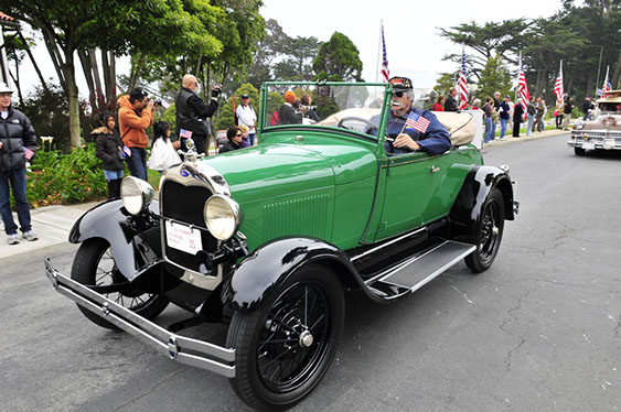 In what has become a Memorial Day tradition, club members assembled early on Monday morning May 25th at the Pacific Rod and Gun Club for coffee and pastries, in preparation for our drive to the San Francisco Presidio for the annual Memorial Day observance. The group drove together just as we had last year north on the Great Highway and then east along Lake Street, entering the Presidio through the Arguello gate. We were met at the Main Post by club member Kev Enderby, who had driven his roadster slowly up the El Camino Real from Redwood City earlier that morning. At the request of US Park Rangers we assisted in raising the huge ceremonial American flag. Then at the appointed hour we lined up our cars and joined the official City and County’s 141st Memorial Day Observance and Parade and along with many others entered the Presidio National Cemetery, parking our cars in a row at a special spot set aside for us by the Mayor’s Citizens Organizing Committee. Our club members stood with the hundreds of San Franciscans and others in paying tribute to those veretans who served our Nation in uniform. The SF Model A Club was recognized and thanked both in the official program and from the podium for our continued participation in this annual event.
