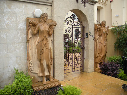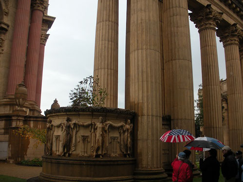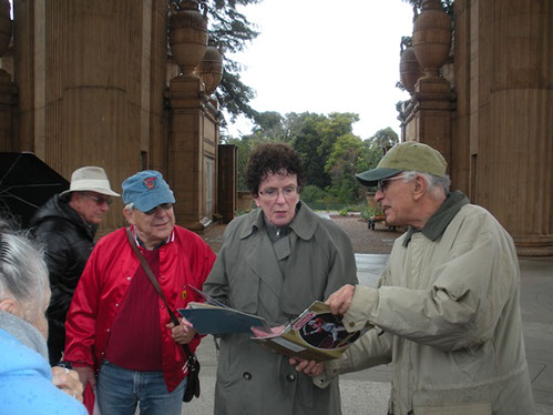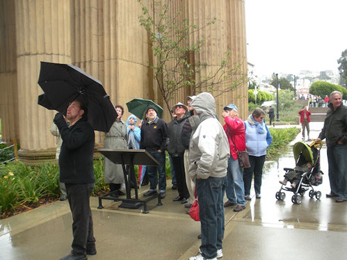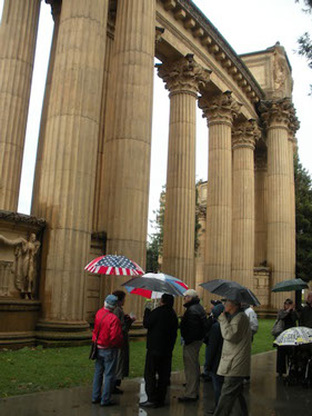 Our group, chilled and soggy, walked the adjacent neighborhood. Our guide Barbara Casey discussed how residents of the Marina worked to raise the funding that supported the restoration and renovation of the lagoon and Palace. Barbara reviewed the history of the Fair and specifically the Palace of Fine Arts from the design by Bernard Maybeck to its demolition in 1964 and restoration. What we have today is an exact reproduction of the original Palace in steel and concrete. The original was a temporary structure made of plaster and burlap fiber.