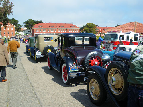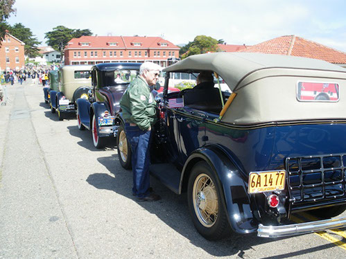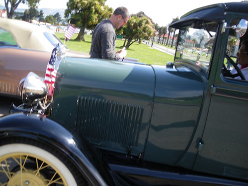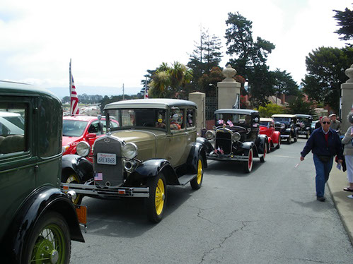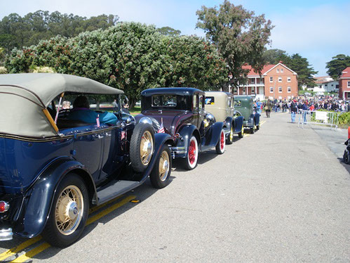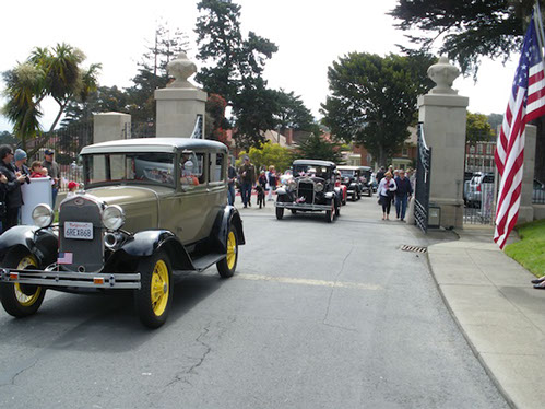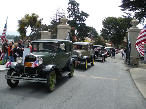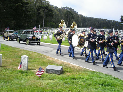 The cemetery is in full decoration. Flags of various sizes fly all ‘round. We loop up through the cemetery and park our cars behind the spectators seating. Everyone seems to like the cars. We get a lot of thumbs-up gestures and photos. Old timers come by to swap stories about the fun they had riding in the rumble seat of the family Model A or to ask, "What year is it?"