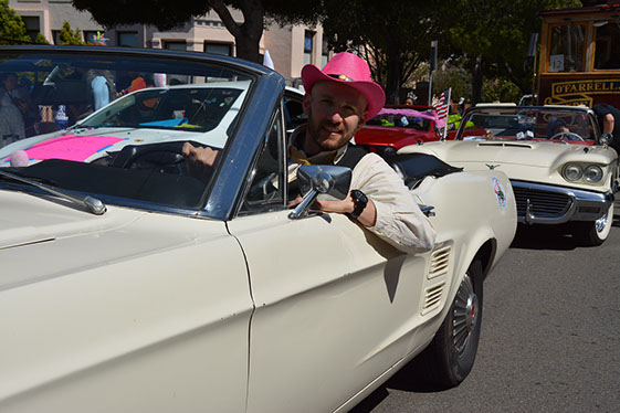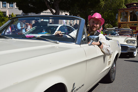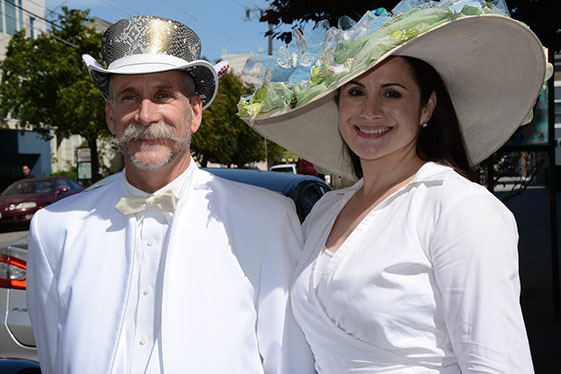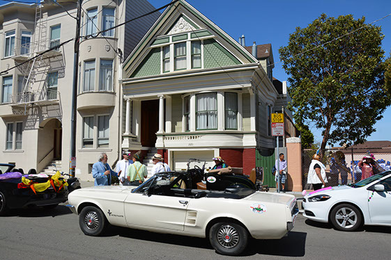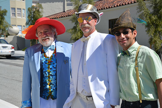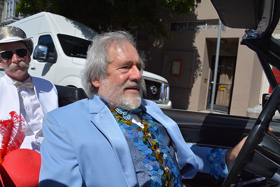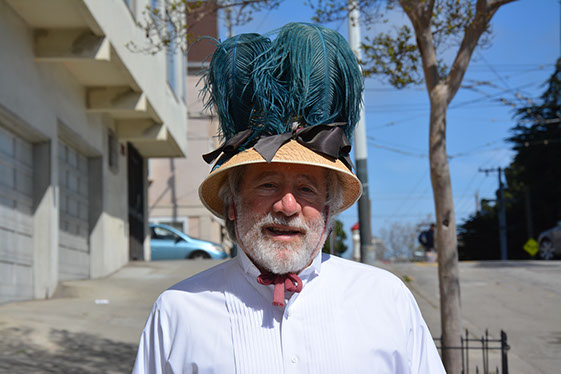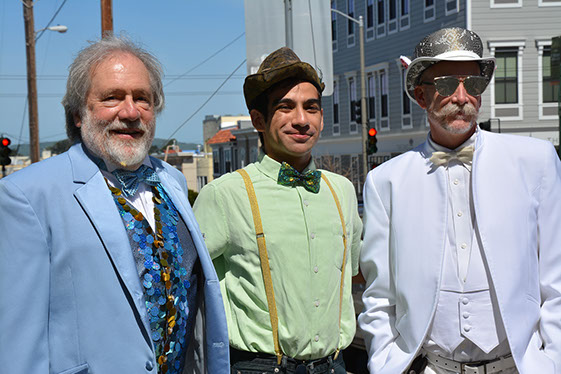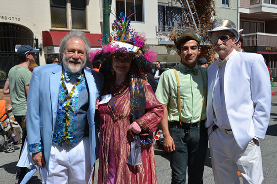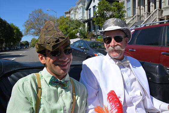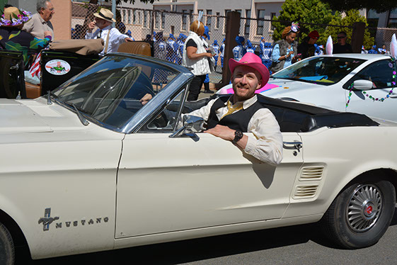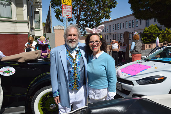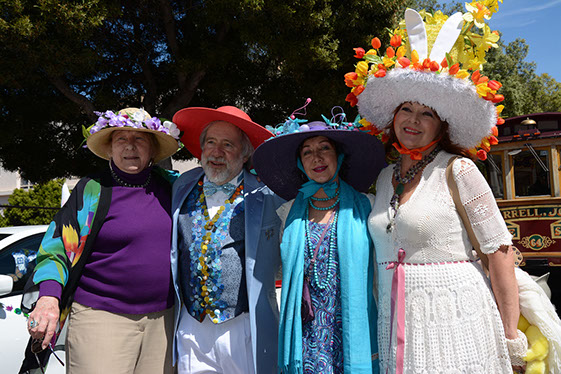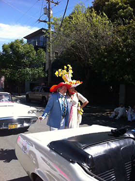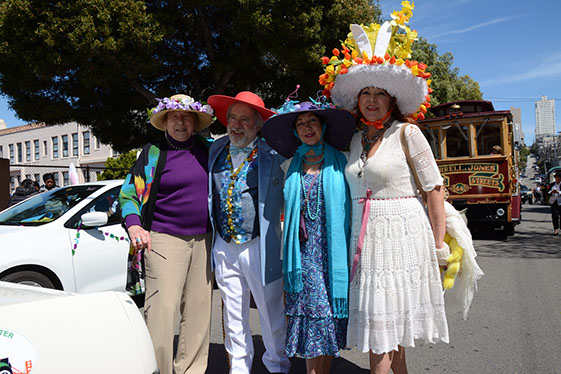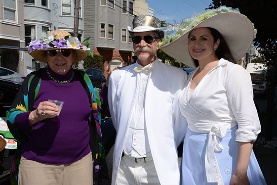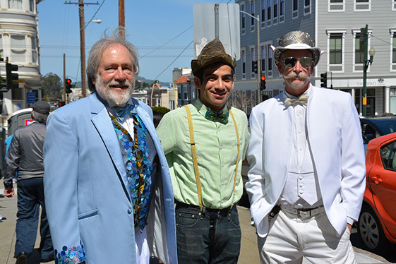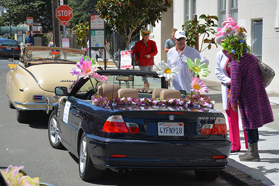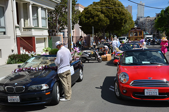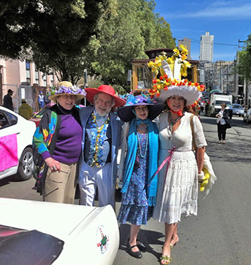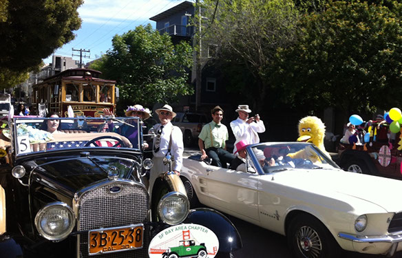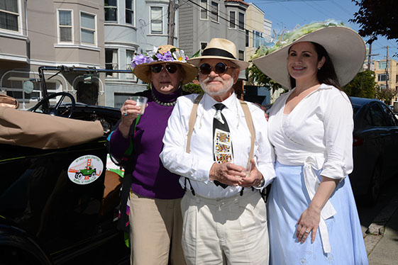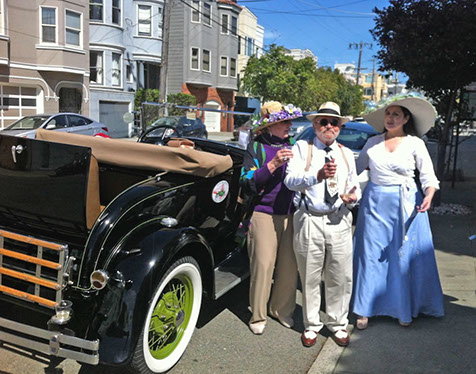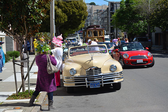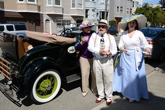 On Sunday March 27 members of our club participated in Union Street's 25th Annual Easter Parade and Celebration. Following the leadership of Ralph Hoffschildt and his wife Rita in their lovely 1930 Roadster, Walter and his Mustang full of gentlemen, each wearing a lovely Easter bonnet, made their way along Union Street past a surprisingly huge throng of spectators. Several thousand families, mothers, fathers, grandparents, multitudes of children, and assorted others lined the parade route from Laguna Street to Fillmore Street.