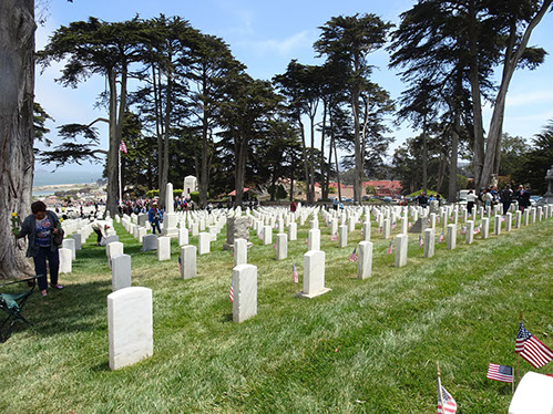 The event begins with a Grand March from the Parade Ground into the National Cemetery. Marching units from local military schools, a Marine Corp Band, and veterans in full uniform, are formed into groups and are ushered into their place by parade organizers. By parade time there is assembled along the parade route a substantial gallery of onlookers, mostly veterans and their families. Once the band strikes up we began the short parade into the San Francisco National Cemetery.